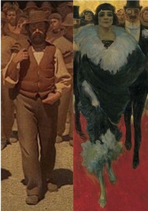 This work immediately made me think, by contrast, about another iconic image from that time: Il Quarto Stato (The Fourth Estate) by Giuseppe Pellizza da Volpedo (1901). In it, we see another march—a solemn procession of the working class, a compact group of men and women advancing with a determined step towards a future of social redemption.