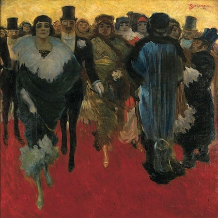 Recently, I came across an artwork, Mondanità or Uscita dal veglione by Aroldo Bonzagni (1910), which perfectly captures the carefree side of the Belle Époque. The subjects of Milan’s high society are depicted as they leave a party and strut confidently down a red carpet, brimming with euphoria and trust in a bright future. Yet, knowing Bonzagni, it is impossible not to detect a subtle note of sarcasm: an implicit critique that reveals how fleeting this ostentatious luxury is, and how oblivious this bourgeois class is in its arrogance, standing on the brink of decay.