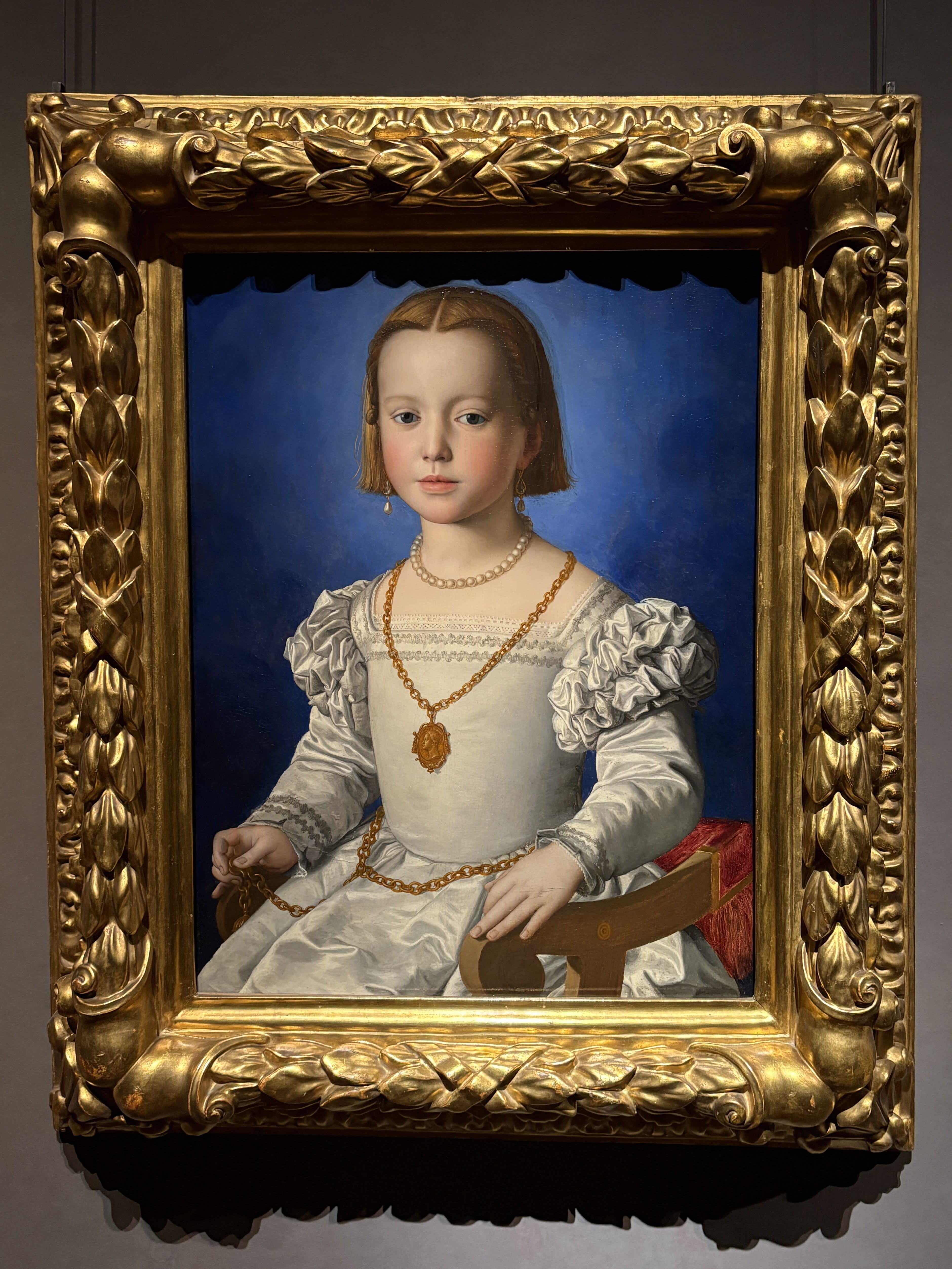 Bronzino dresses her in white, a nod to her name (Bianca means “white”) and innocence. She wears pearls and a medallion with her father’s portrait, adorned like a grown woman. Yet her hands tell a different story. They fidget with the belt’s tassel, press the chair’s arm with restless energy: these are the hands of a child who would rather be playing than sitting still.